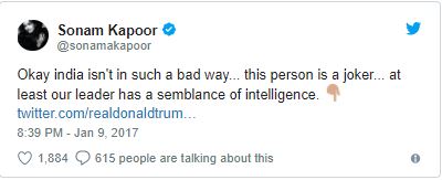 “Okay, India isn’t in such a bad way… This person(referring to Trump) is a joker… at least our leader has a semblance of intelligence,” Sonam had tweeted.