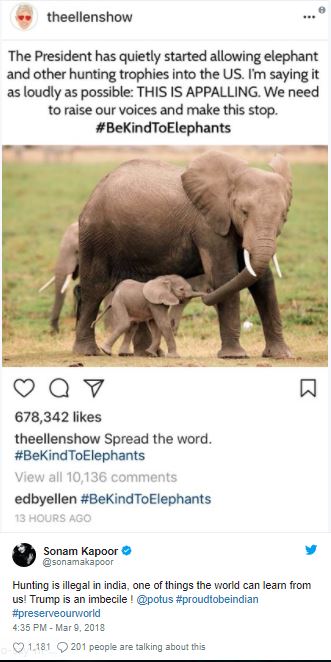 Sharing Ellen's tweet, Sonam Kapoor wrote, "More Hunting is illegal in India, one of the things the world can learn from us! Trump is an imbecile! @potus #proudtobeindian  #preserveourworld."