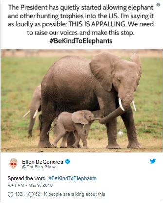 It all started with a tweet by comedian and talk show host Ellen DeGeneres. Ellen took to Twitter to share a picture that read, " The President has quietly started allowing elephant and other hunting trophies into the US. I'm saying it as loudly as possible: This is appalling. We need to raise our voices and make this stop." She also urged her followers to spread the word.