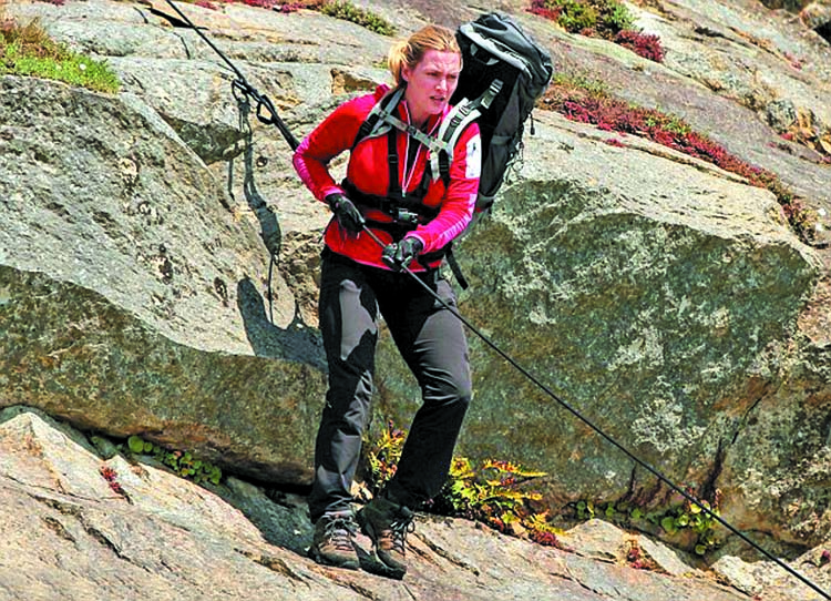 While traversing down Winslet gets frightened as she loses her footholds from the jagged edges. Bear says to swing to the right and for some minutes Kate cannot really hold onto anything. At one point, Kate even mentions she can't hear Bear and the situation seems to look tricky. Soon, Kate does grab hold onto something, as Bear had also suggested, and keeps traversing and Bear said he is coming down to her. He tells her to stay where she is as he is coming to her. Bear throws a rope and Kate grabs it a bit and Bear comes down to join her on the rocky edge.