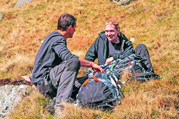 Bear comments that Snowdonia's terrain is dynamic and unpredictable so it is a good place or British Special Forces to get training and he liked the roughness of the terrain itself. The first rock face they come across is 150+ feet up and vertical and not overhanging as Bear was hoping to ease Kate down.