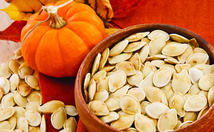 Pumpkin seeds: Already a favorite autumnal treat, there are good reasons to start eating pumpkin seeds year-round. Also known as pepitas, one ounce of pumpkin seeds contain 4.2 mg of iron. They're also a concentrated source of zinc, magnesium, and fatty acids.